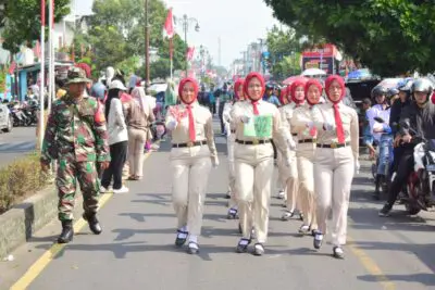 Para peserta pun beragam. Pelajar mengenakan seragam sekolah serta ditambah asesoris pelengkap. Sedangkan peserta OPD dan Ormas mayoritas mengenakan training set. Dan ada satu regu peserta yang mengenakan busana bernuansa batik.(BR1)