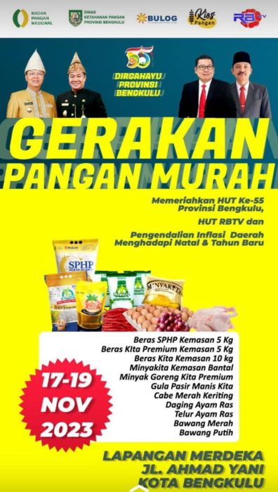 Sebelumnya, Asisten I Setda Provinsi Bengkulu Khairil Anwar yang juga sebagai Ketua Panitia HUT ke-55 Provinsi Bengkulu tahun 2023 mengatakan, dilaksanakan mulai 17 hingga 19 November 2023, Bazar UMKM dan Pasar Murah dalam memeriahkan HUT ke-55 Provinsi Bengkulu dipusatkan di Lapangan Merdeka Kota Bengkulu.