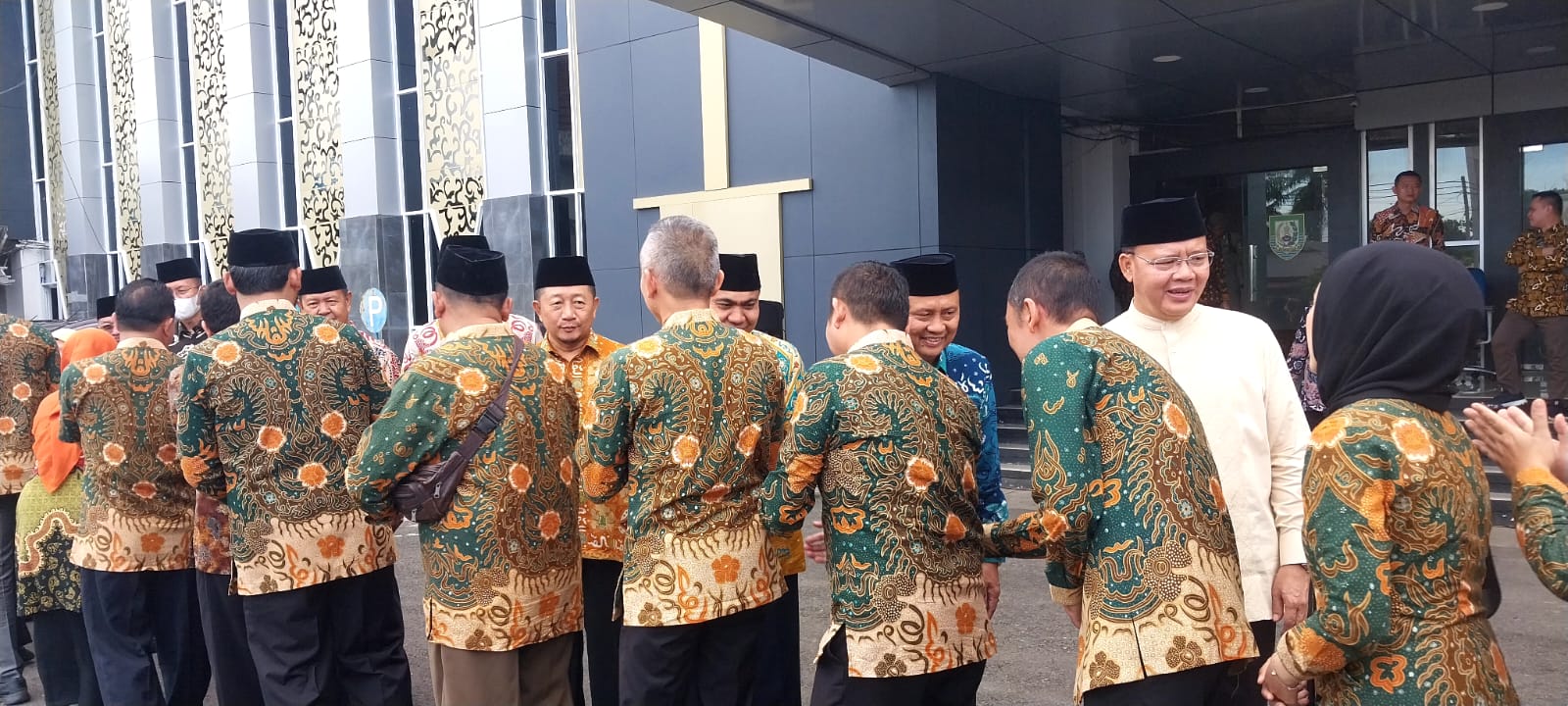 Selesai apel pagi, Gubernur Rohidin, Sekda, para Asisten dan Kepala OPD langsung berjabat tangan untuk melaksanakan halal bihalal, termasuk seluruh ASN dan P3K.(BR1)