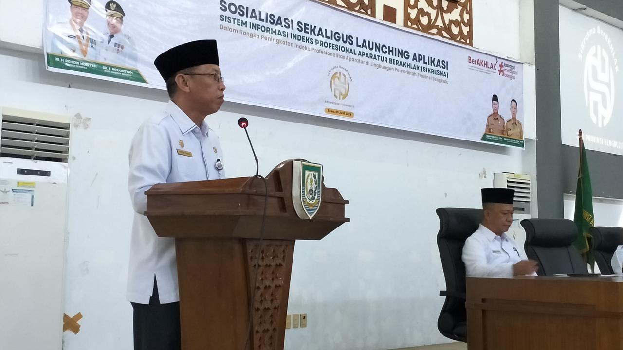 Bengkulu,Beritarafflesia.Com-Asisten III Setda Bengkulu Nandar Munadi membuka kegiatan sosialisasi sekaligus launching aplikasi Sistem Informasi Indeks Profesional Aparatur Berakhlak (SIKRESNA), di aula Gedung Serbaguna Kantor Gubernur Provinsi Bengkulu, Rabu (5/6/2024).