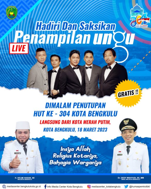 “Kepada seluruh adik sanak warga Kota Bengkulu tercinta, masyarakat dunia di manapun anda berada. Pemerintah Kota Bengkulu mengundang untuk hadir di Kota Merah Putih pada tanggal 18 malam dalam rangka memeriahkan HUT Kota Bengkulu 304. Insya allah religius kotanya, bahagia warga akan dimeriahkan konser artis nasional ‘Ungu Band’ gratisss, tisss,” ajak Helmi.