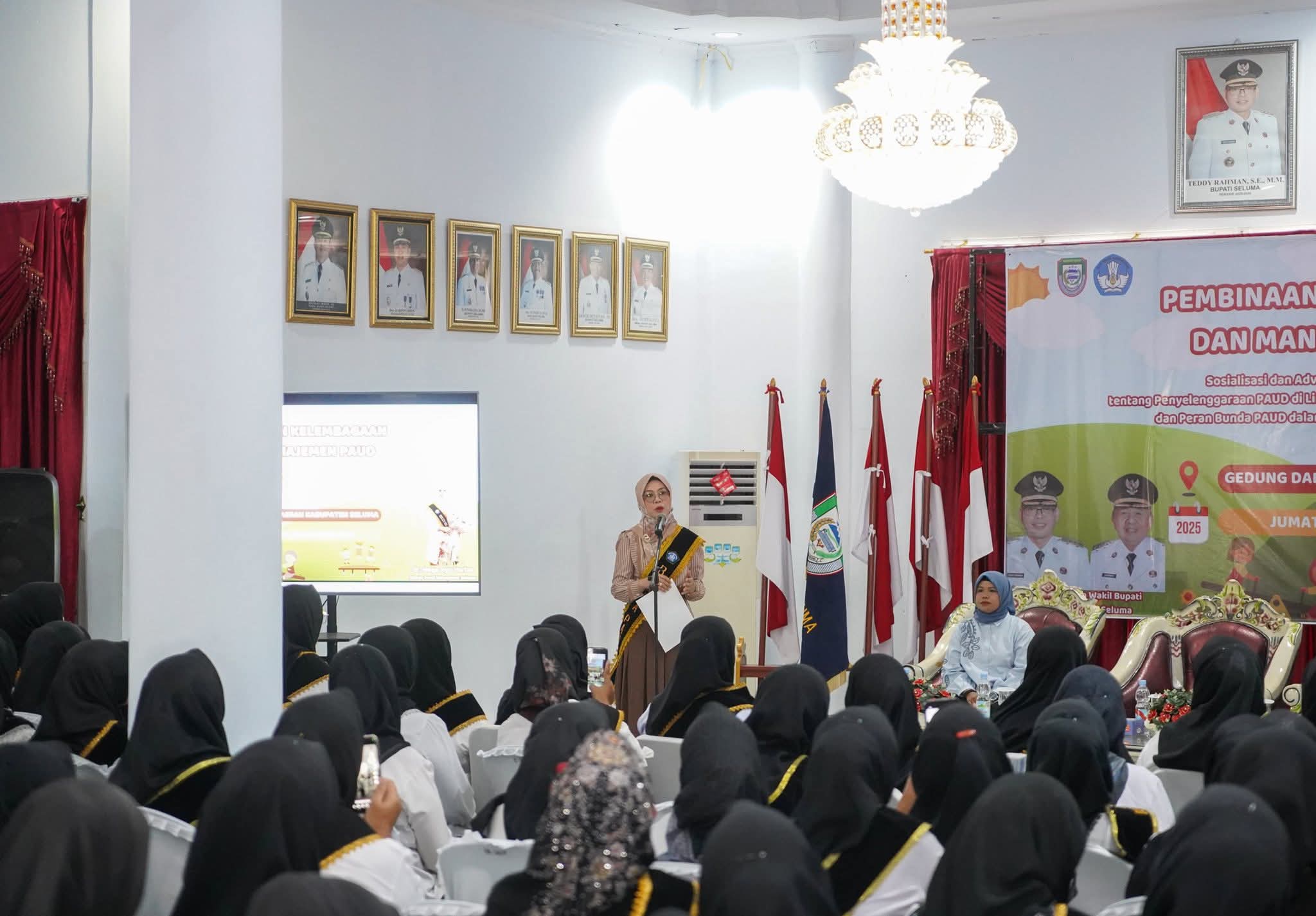 Seluma, Beritarafflesia.com.-  – Bunda Pendidikan Anak Usia Dini (PAUD) Kabupaten Seluma, dr. Mega Ayu Variza Teddy Rahman, membuka kegiatan Sosialisasi dan Advokasi Peraturan Bupati tentang Penyelenggaraan PAUD di lingkungan Pemerintah Kabupaten Seluma. Acara ini berlangsung di Gedung Daerah Serasan Seijoan, Jumat (3/10/2025).