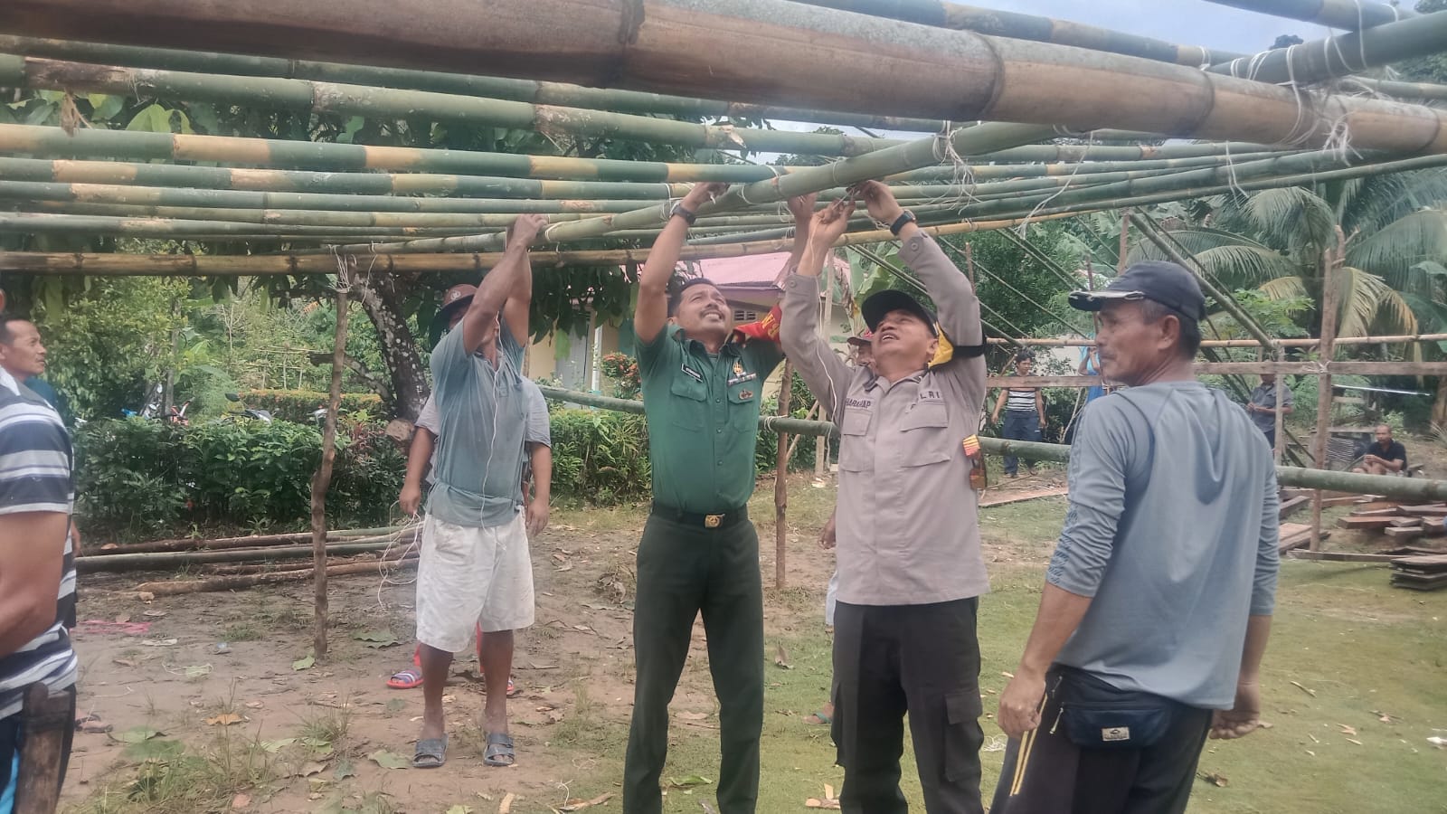 Bengkulu Utara,Beritarafflesia.Com-Demi terciptanya situasi Kamtibmas yang kondusif,Babinsa Koramil 423-06/Enggano bersinergi dengan Bhabinkabtibmas Polsek Enggano melaksanakan Gotong royong kerumah salah seorang warga binaanya An. Bapak yopi yang akan melaksanakan Acara Aqiqah Anaknya bertempat didesa Apoho Kec.Enggano Kab.Bengkulu Utara,Kamis (15/06/2023).