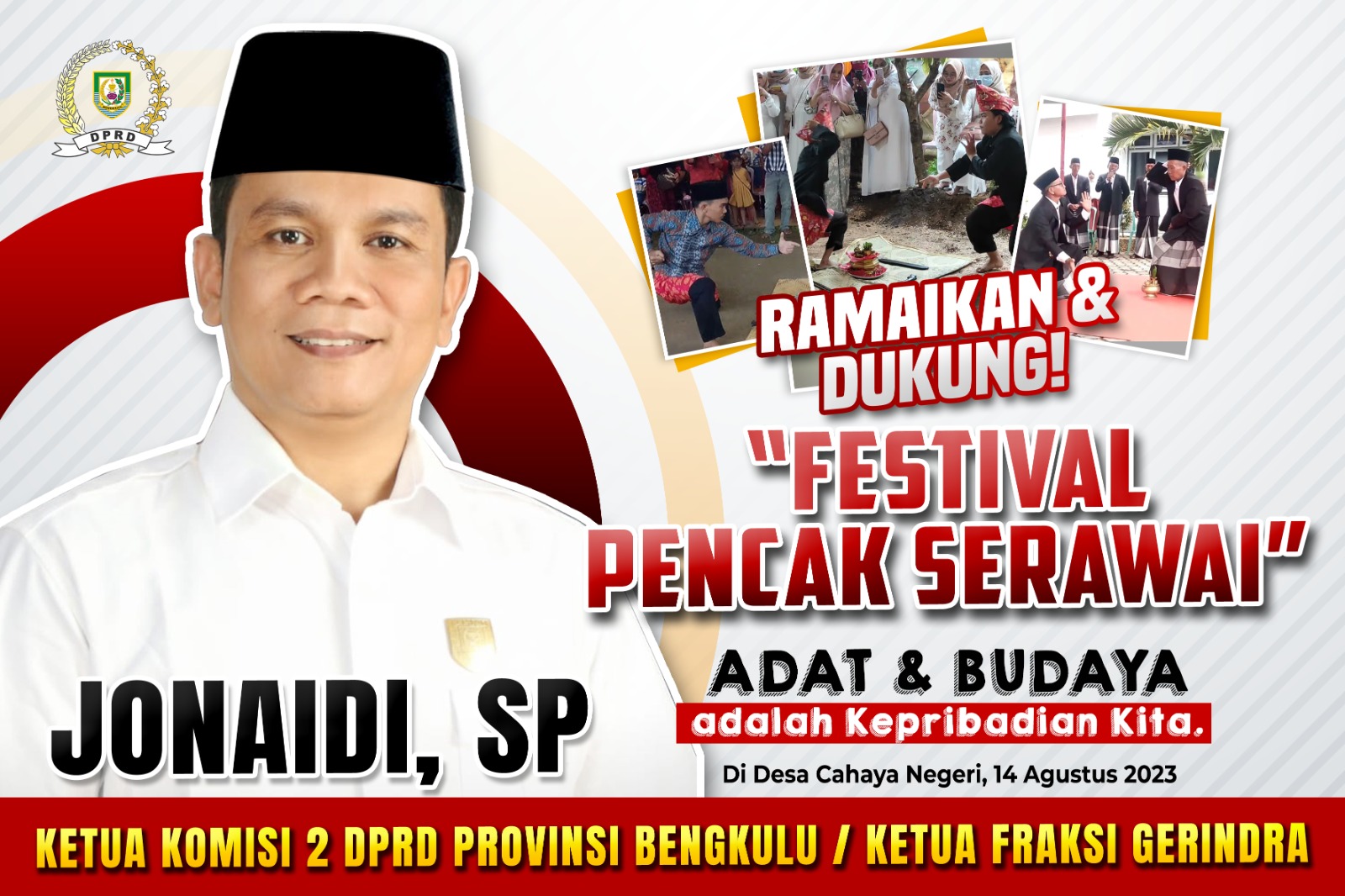 Bengkulu,Beritarafflesia.Com– Memeriahkan HUT RI ke-78 di Provinsi Bengkulu, akan diadakan “Festival Pencak Serawai” di Kabupaten Seluma,didukung oleh Ketua Komisi II DPRD Provinsi Bengkulu Jonaidi SP,Rabu (09/08/2023)
