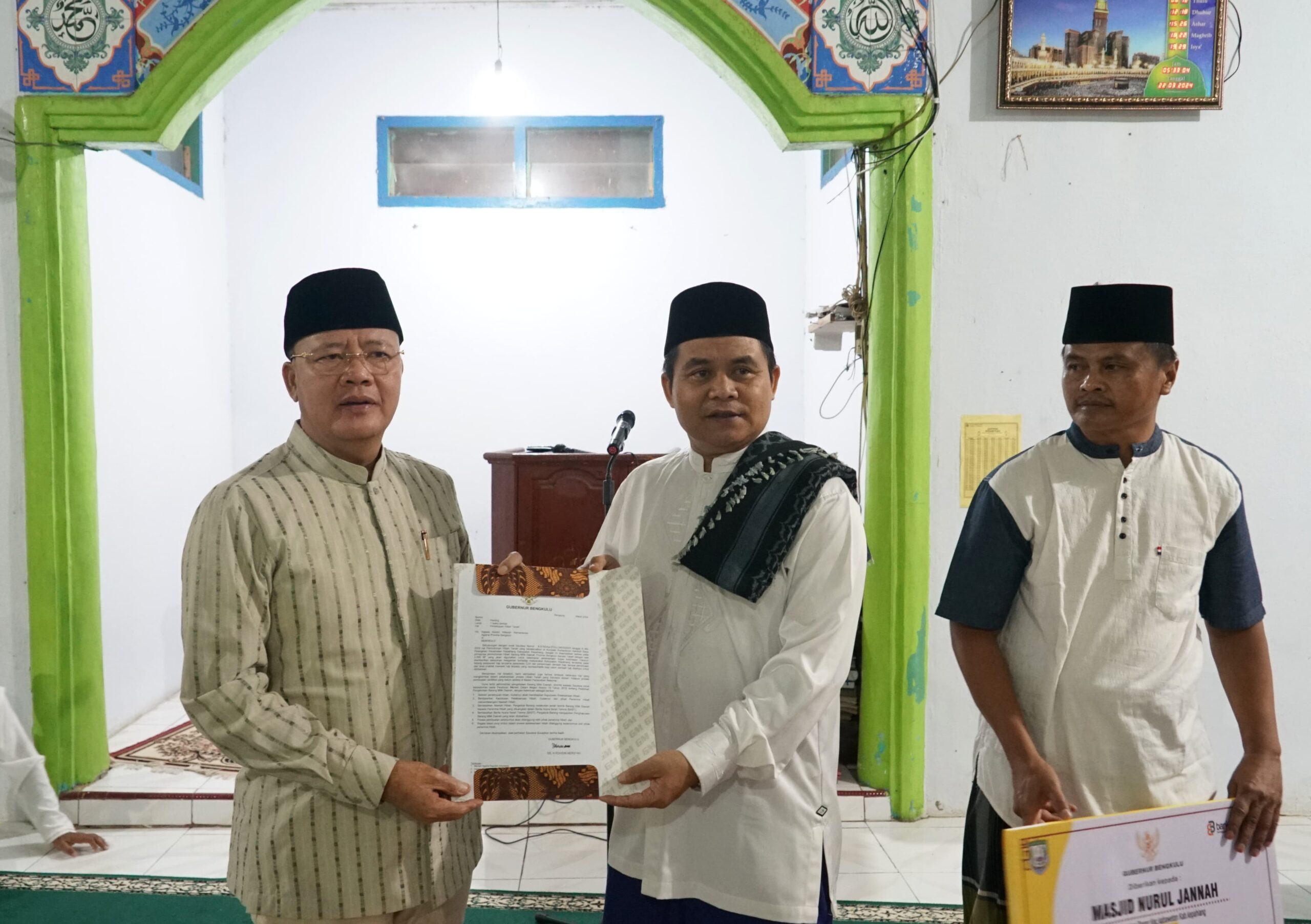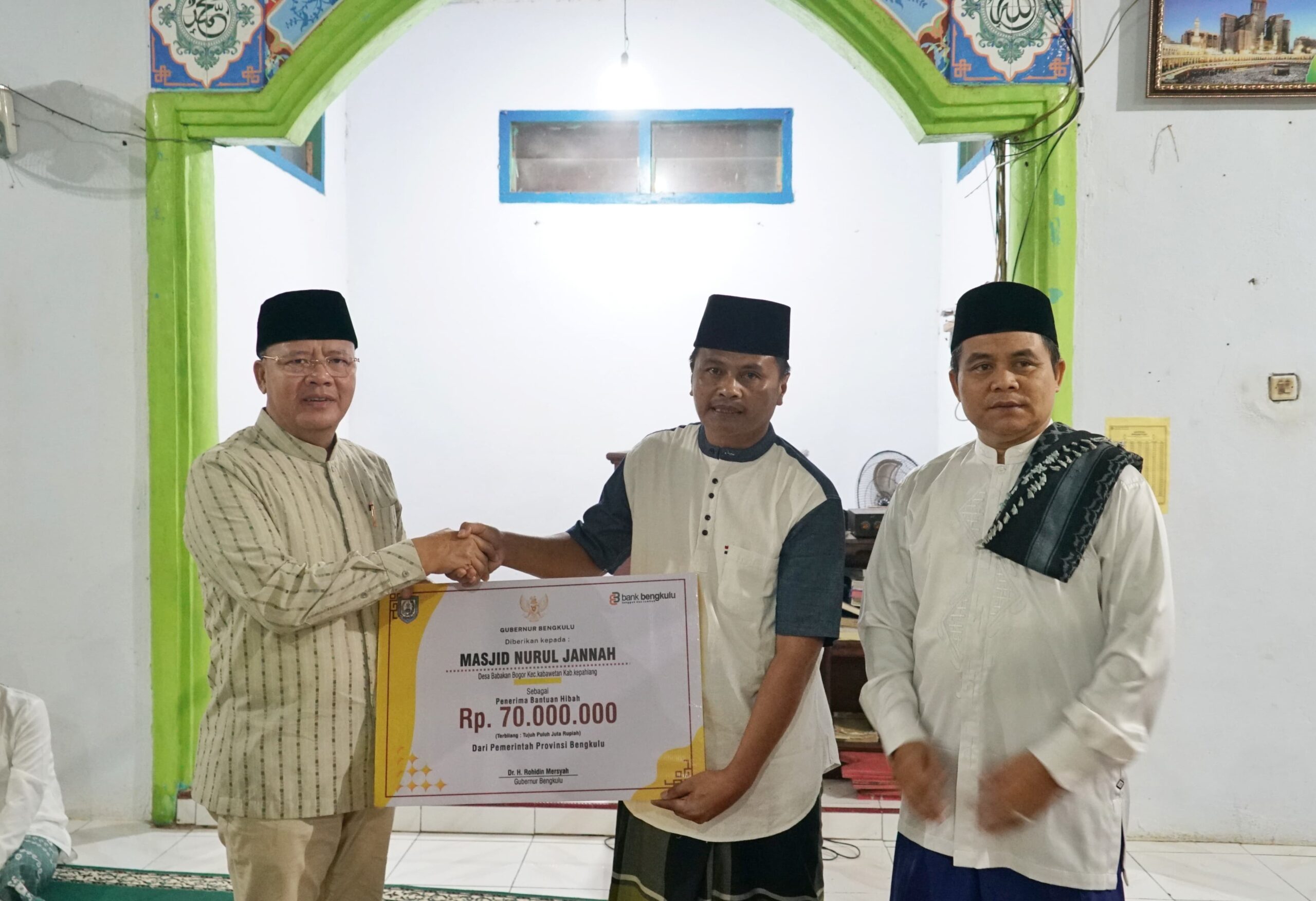 Selain menyerahkan surat persetujuan hibah, Gubernur Rohidin yang sekaligus menggelar Safari Ramadhan di Masjid Nurul Jannah, juga memberikan bantuan dana hibah pembangunan masjid sebesar 70 juta rupiah.