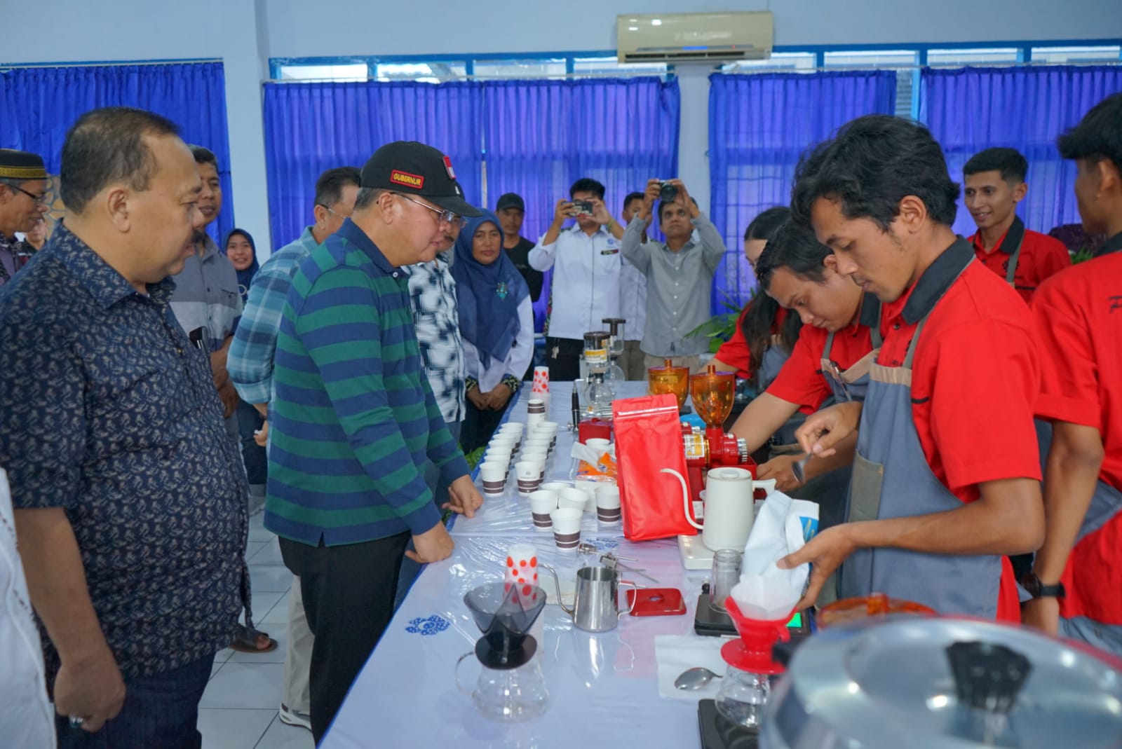 Pada kesempatan ini Gubernur Rohidin juga menyaksikan demo para barista alumni UPTD Pelatihan Kerja Kepahiang menyajikan aneka jenis minuman kopi.