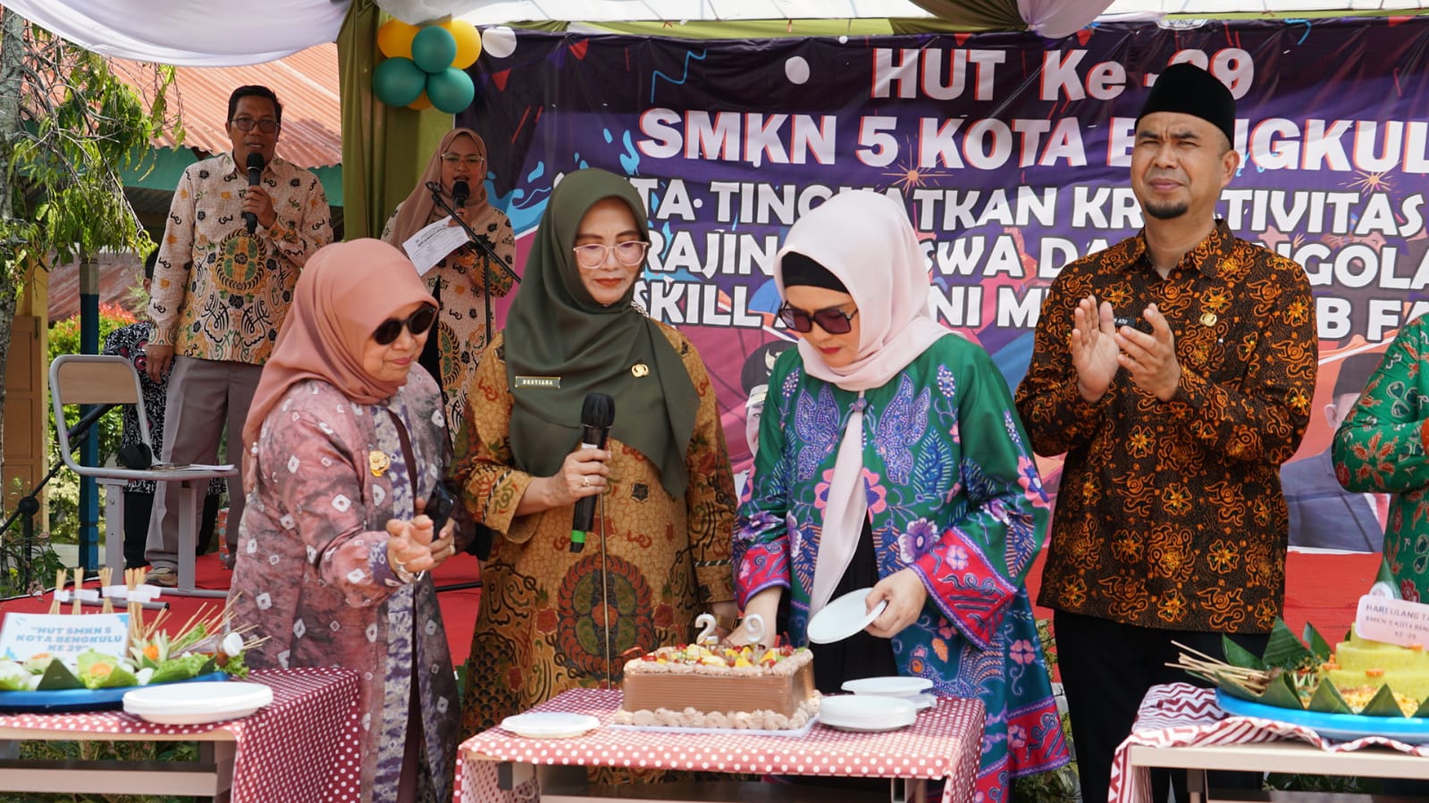 Bengkulu,Beritarafflesia.Com-Ketua Dewan Kerajinan Nasional Daerah (Dekranasda) Provinsi Bengkulu Derta Rohidin hadiri acara HUT ke-29 SMKN 5 Kota Bengkulu, Job Fair dan Pameran Kerajinan (Produk TeFa Semengga) di SMKN 5 Lingkar Barat Kota Bengkulu, Kamis (5/10/2023).