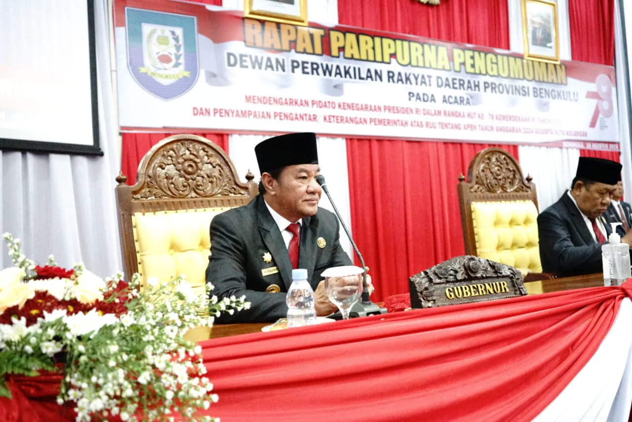 Wakil Gubernur (Wagub) Bengkulu Rosjonsyah bersama Forkompinda serta seluruh Pimpinan OPD di lingkup Pemerintah provinsi Bengkulu mengikuti rapat paripurna DPRD Provinsi Bengkulu dengan agenda mendengarkan pidato kenegaraan Presiden Joko Widodo dalam rangka peringatan HUT ke-78 RI, Rabu (16/8/2023).