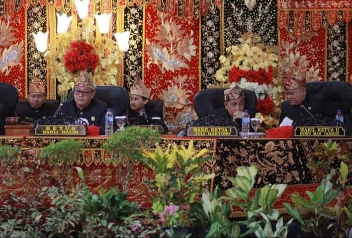 Rapat paripurna istimewa ini dipimpin Ketua DPRD, Barli Halim, S.E didampingi Wakil Ketua I, Juli Hartono, S.E, dan Wakil Ketua II, Dendi Man Tarmizi, S.E, S.H, dan diikuti Anggota DPRD dari semua unsur fraksi.