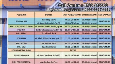 Jadwal Layanan Poliklinik di Rumah Sakit Harapan dan Doa Kota BengkuluAdministrator30/11/202330/11/2023Banner, RSHD3487 Dilihat Bengkulu Beritarafflesia.com- Jadwal Layanan Poliklinik di Rumah Harapan dan Doa Kota Bengkulu mulai di buka pada hari Jumat 01 Desember 2023. Post Views: 3,487 Share