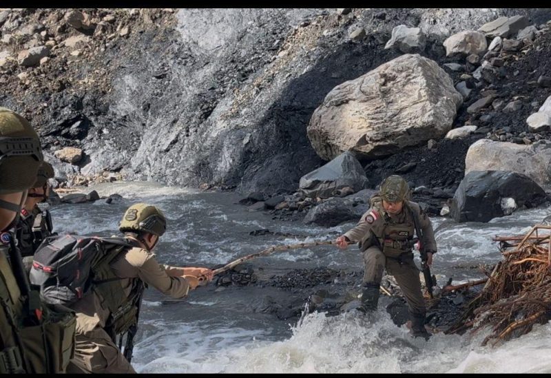 Di lapangan, personel terlihat saling membantu saat menyeberangi sungai dengan arus deras serta bergerak hati-hati di jalur berbatu.