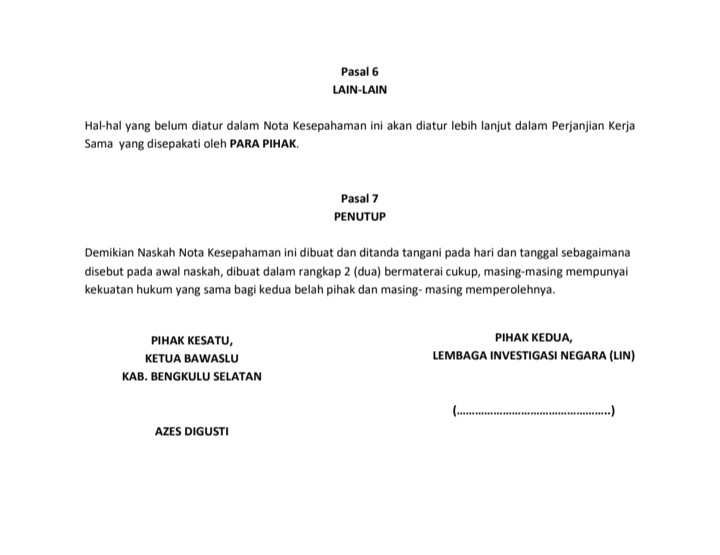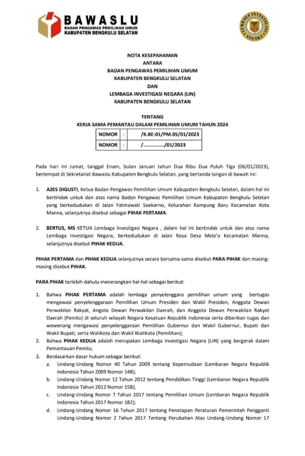 Penandatanganan nota kesepakatan kerjasama di laksanakan langsung oleh Ketua BAWASLU Bengkulu Selatan AZIZ DIGUSTI dan KETUA LEMBAGA INVISTIGASI NEGARA (LIN) Bertus  MS yang saksikan sekretaris Bawaslu Bengkulu selatan bersama Sekretaris Lembaga Investigasi Negara beserta anggota, bertempat di kantor Bawaslu Bengkulu Selatan, Jumat (6/1/2023)