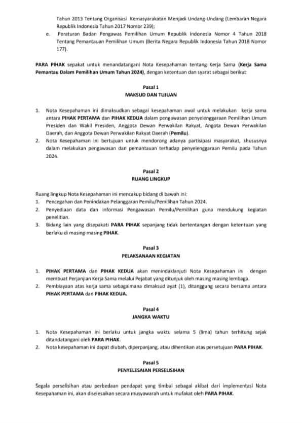 Nota kesepakatan kerjasama ini dilakukan Bawaslu guna untuk menciptakan kondusifitas pelaksanaan Pemilu 2024 mendatang. Hal ini Berdasarkan Peraturan dan UUD yang berlaku