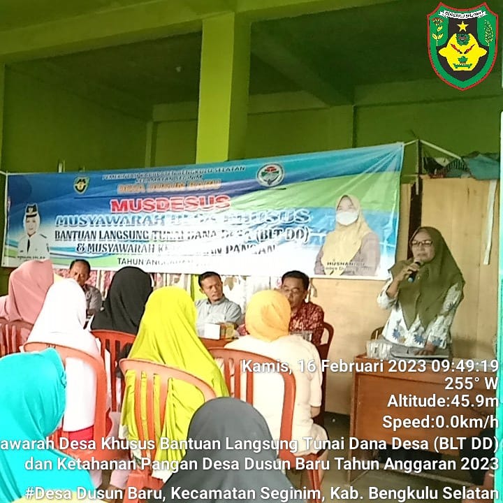 Bengkulu selatan Beritaraflesia.com – Pemerintah desa dusun baru kecematan seginim Kabupaten Bengkulu Selatan menggelar kegiatan Musyawarah Desa khusus (Musdesus) dalam Rangka Validasi data terkait penerima Bantuan Langsung Tunai ( BLT) DD tahun Anggaran 2023, Bertempat di kantor desa dusun baru Kamis (16/2/2023)