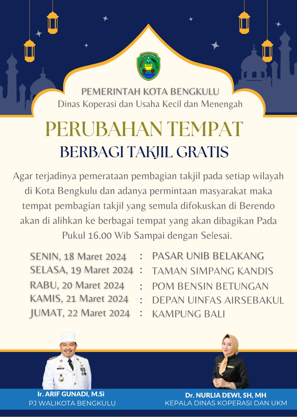 “Untuk perubahan, pembagian takjil dari tanggal 18-22 Maret akan dilakukan di beberapa titik, mulai dari Pasar Unib Belakang, Taman Simpang Kandis, Pom Bensin Betungan, Depan UINFAS dan terakhir Kampung Bali,” jelas Kepala Dinas Koperasi dan UKM Nurlia Dewi, Jumat (15/3/2024).