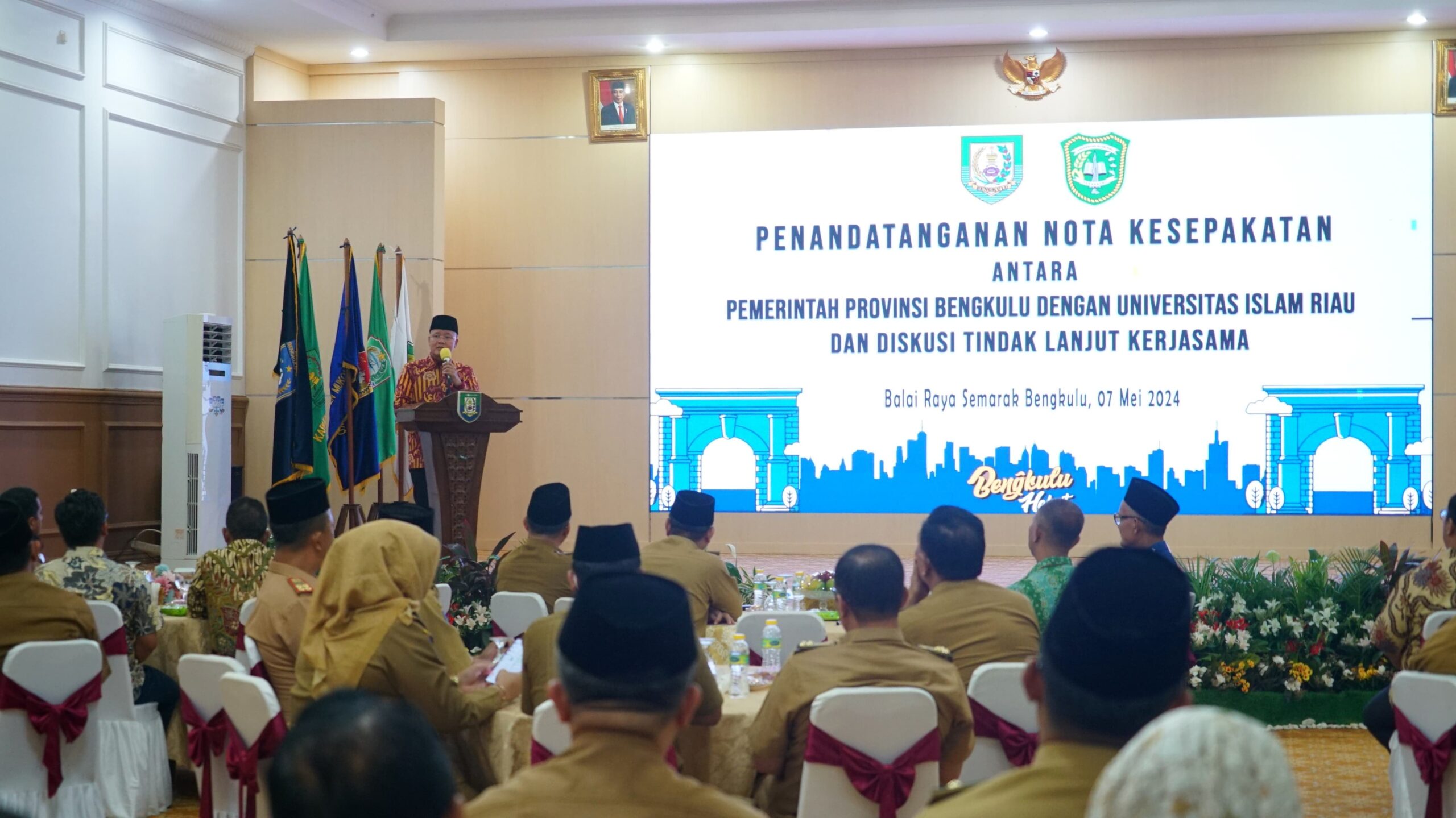 Bengkulu,Beritarafflesia.Com-Gubernur Rohidin Mersyah tandatangani nota kesepakatan kerja sama antara Pemerintah Provinsi Bengkulu dengan Universitas Islam Riau (UIR) di Balai Raya Semarak Bengkulu, Selasa (7/5/2024).