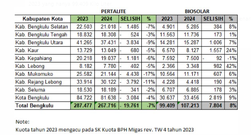 Dalam surat tersebut dijelaskan, kuota Bio Solar Subsidi untuk Provinsi Bengkulu dialokasikan untuk tahun 2024 sebesar 107.213 Kilo Liter. Hal ini mengalami peningkatan dari ketetapan kuota tahun 2023 yang hanya 99.409 Kilo Liter.