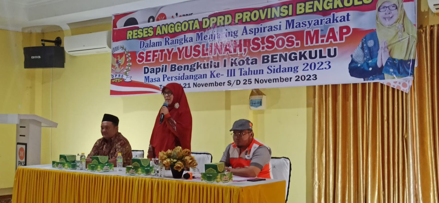 Bengkulu,Beritarafflesia.Com-Sebagai bagian dari menyerap aspirasi masyarakat (Reses) pada masa sidang ke-III, Anggota DPRD Provinsi Bengkulu dapil Kota Bengkulu, Sefty Yuslinah, S.Sos, M.Ap, bertemu dengan masyarakat di Kantor DPW PKS Provinsi Bengkulu. Keluhan masyarakat pun terungkap, fokus utama pada sulitnya mendapatkan bahan bakar minyak (BBM) solar dan tingginya harga beras di kota Bengkulu.