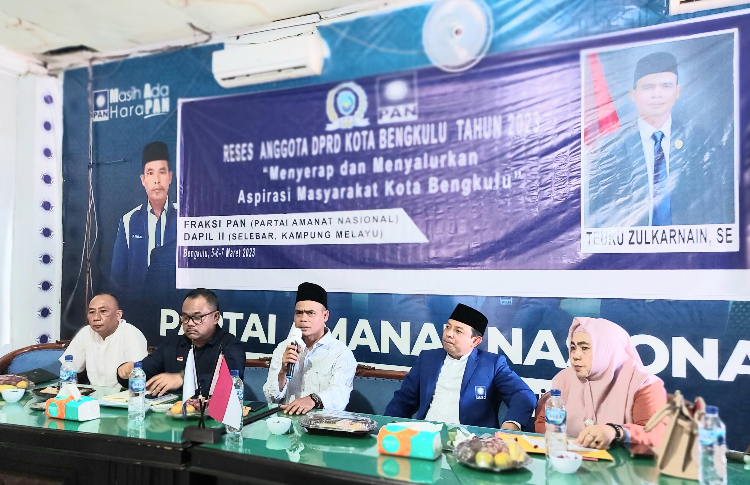 Kota Bengkulu, Beritarafflesia.com- Reses anggota Dewan Perwakilan Rakyat Daerah (DPRD) kota Bengkulu, Teuku Zulkarnain dari Fraksi Partai Amanat Nasional (PAN) dapil kecematan Selebar – Kampung melayu kota Bengkulu, dalam rangka menjaring dan menyalurkan aspirasi masyarakat tahun 2023, yang di dihadiri Wakil Walikota Dedi Wahyudi, berlangsung di kantor DPD PAN di jalan tebeng kelurahan Panorama kecematan singaran Pati Kota Bengkulu, bertempat di Aula DPD PAN Kota Bengkulu,pada minggu pagi, (5/3/2023)