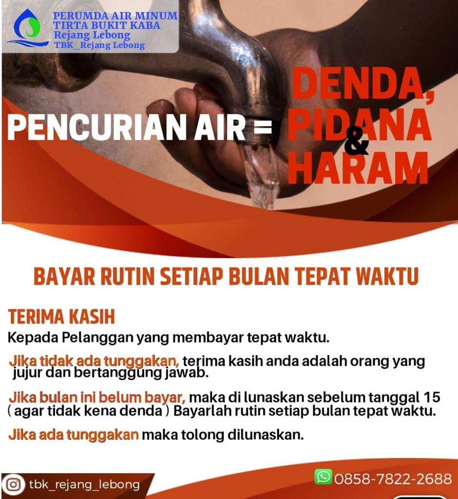 Rejang Lebong, Beritarafflesia.Com-Perumda Air Minum Tirta Bukit Kaba (TBK) Rejang Lebong Menghimbau Masyarakat Untuk Bayar Rutit Setiap Bulan dan tepat waktu, dan juga mengucapakan terima kasih kepada pelanggan yang telah membayar tepat waktu.(BR1)adv