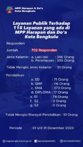 Tercatat Indeks Kepuasan Masyarakat (IKM) selama 2023 mencapai 96,87 persen (Mutu Pelayanan A, sangat baik). Ini menjadi bukti nyata komitmen Pemkot Bengkulu menghadirkan pelayanan publik prima bagi seluruh masyarakat.