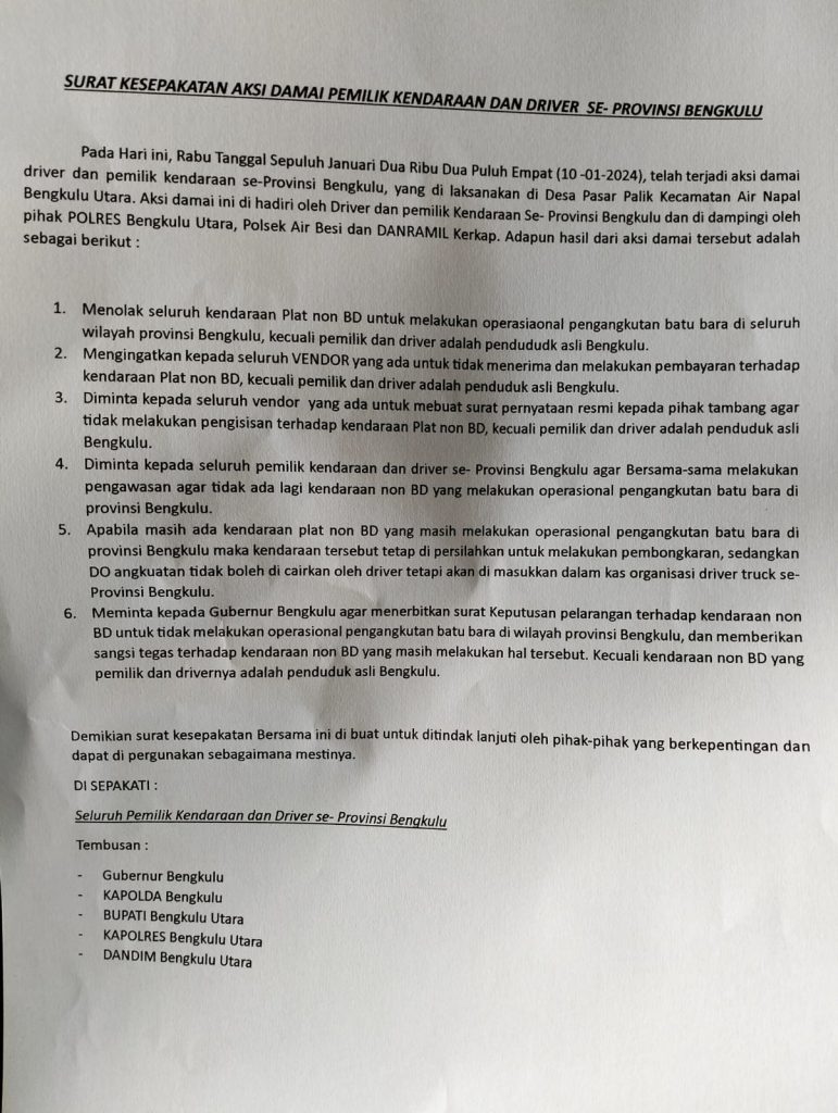Dari 6 kesepakatan tersebut, di antaranya truk berplat non BD dilarang melakukan bongkar muat di tambang batu bara Bengkulu Utara.