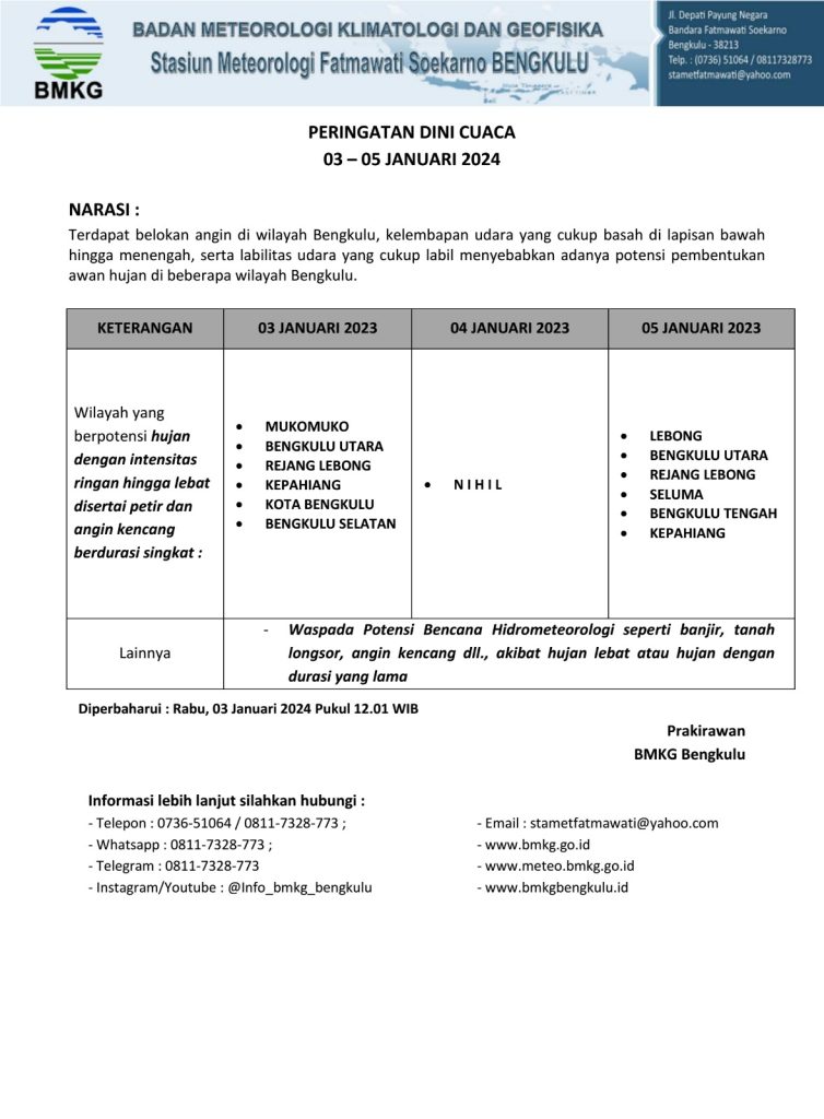 Dari data BMKG Stasiun Meteorologi Fatmawati Soekarno Bengkulu, ada 5 kabupaten yang berpotensi hujan ringan maupun lebat yang disertai petir dan angin kencang pada 3 Januari ini di antaranya Mukomuko, Bengkulu Utara, Rejang Lebong, Kepahiang dan Bengkulu Selatan.